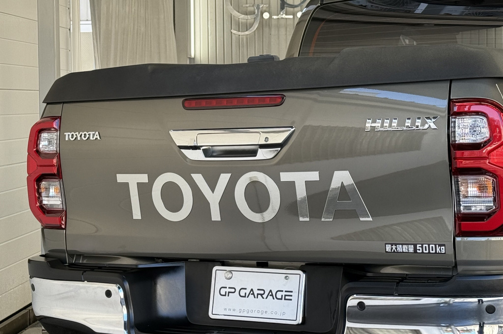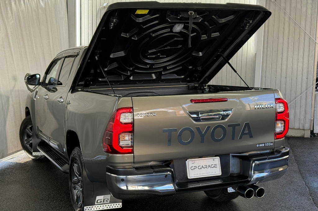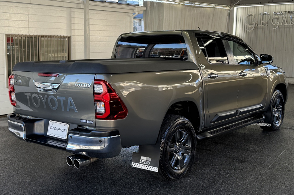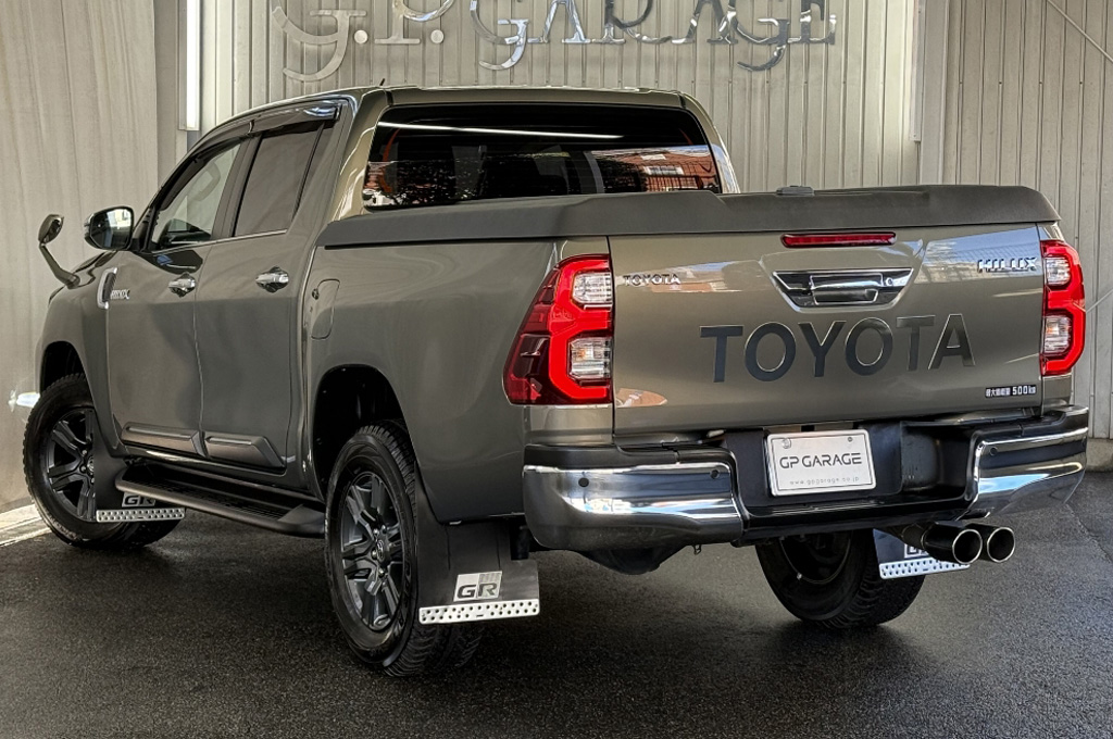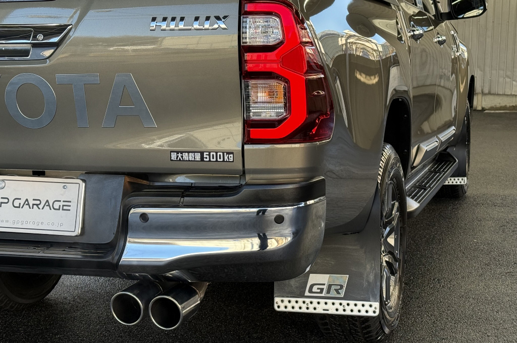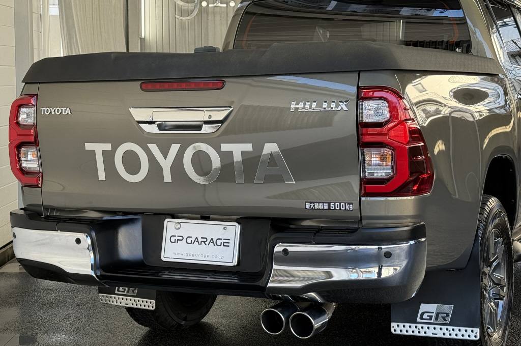 テールゲートのTOYOTAデカールと2本出しマフラーで後ろ姿もカッコいい1台です!