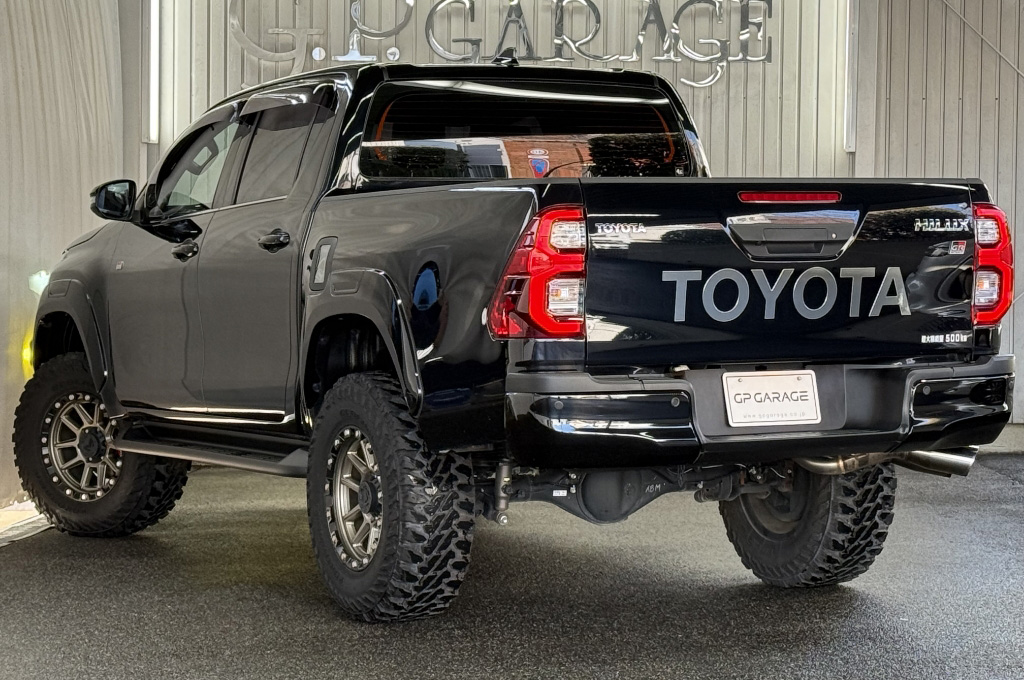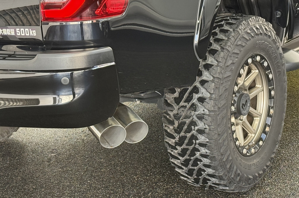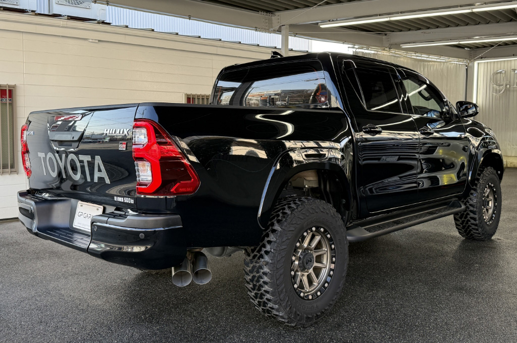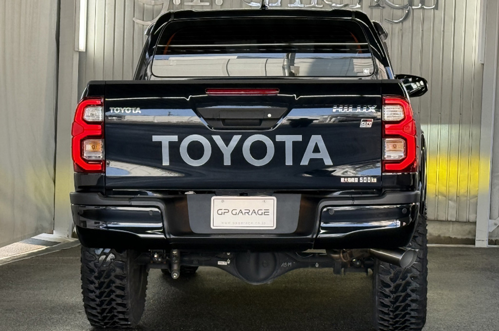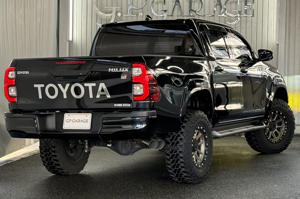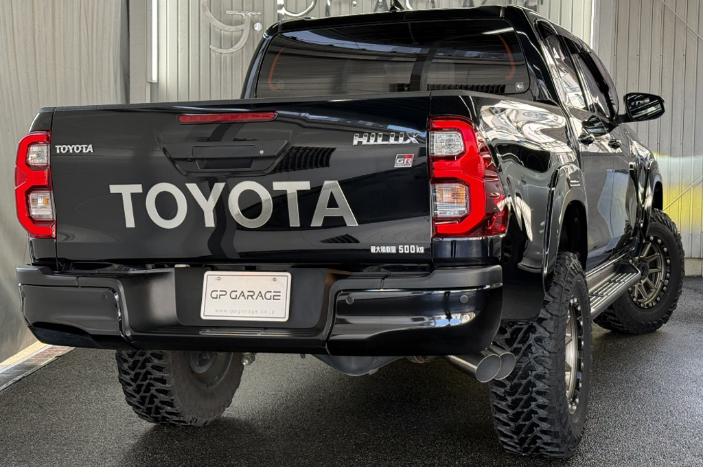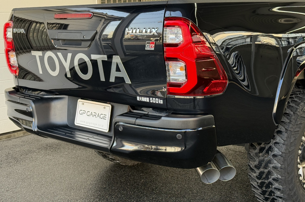 TOYOTAデカールとFUJITSUBO2本出しマフラーで後ろ姿もカッコイイ!ハイラックスZ GRスポーツのアティチュードブラックマイカが入庫しました♪
