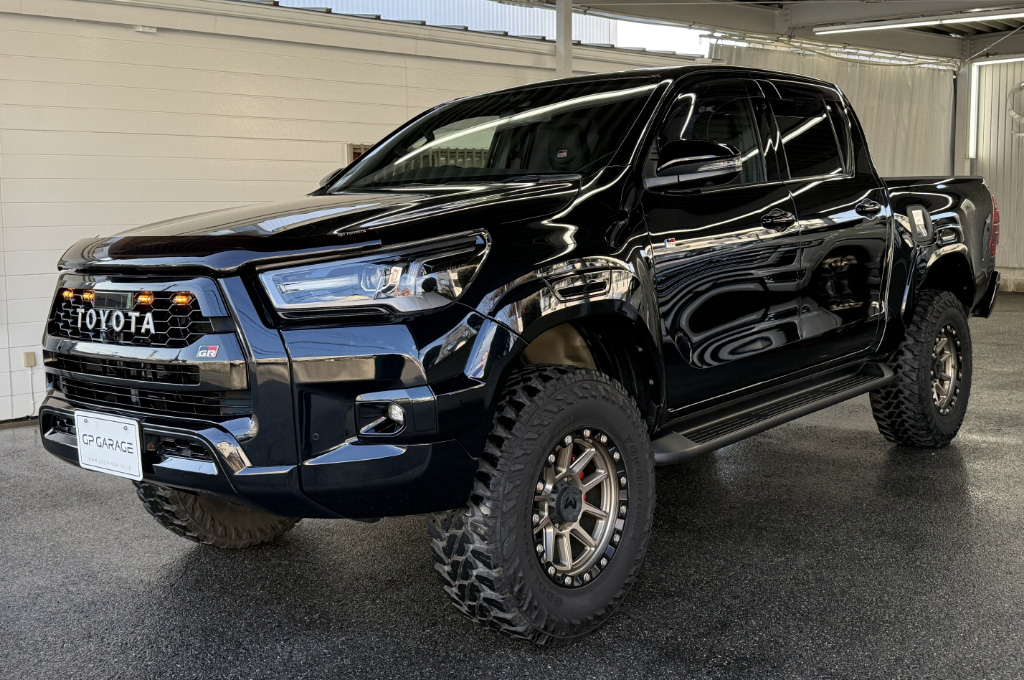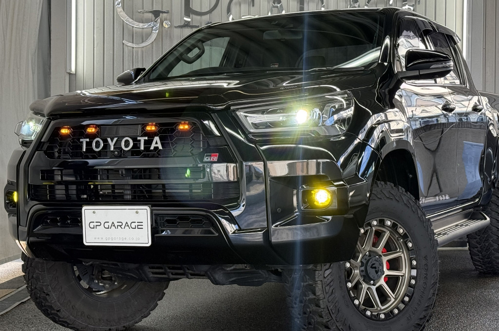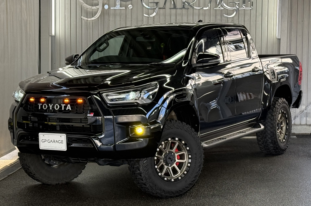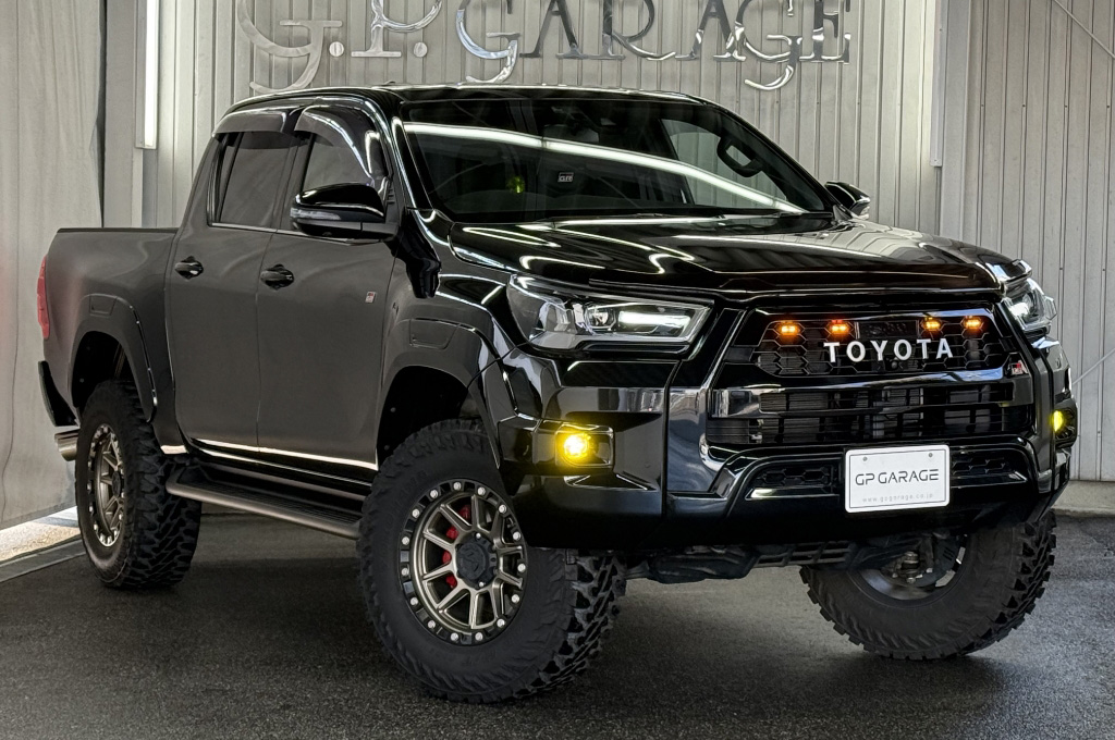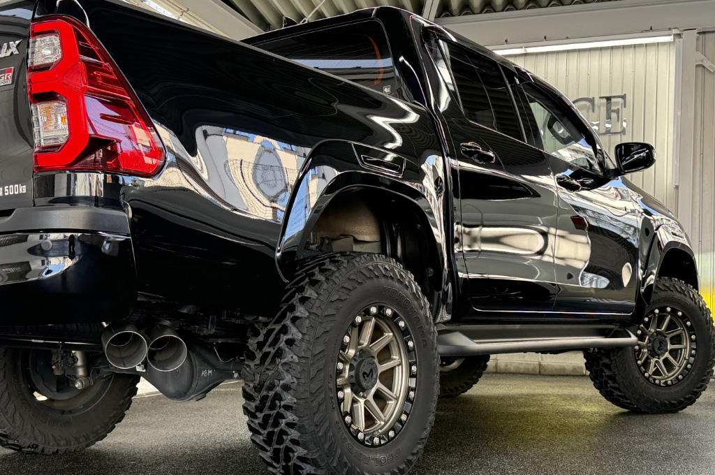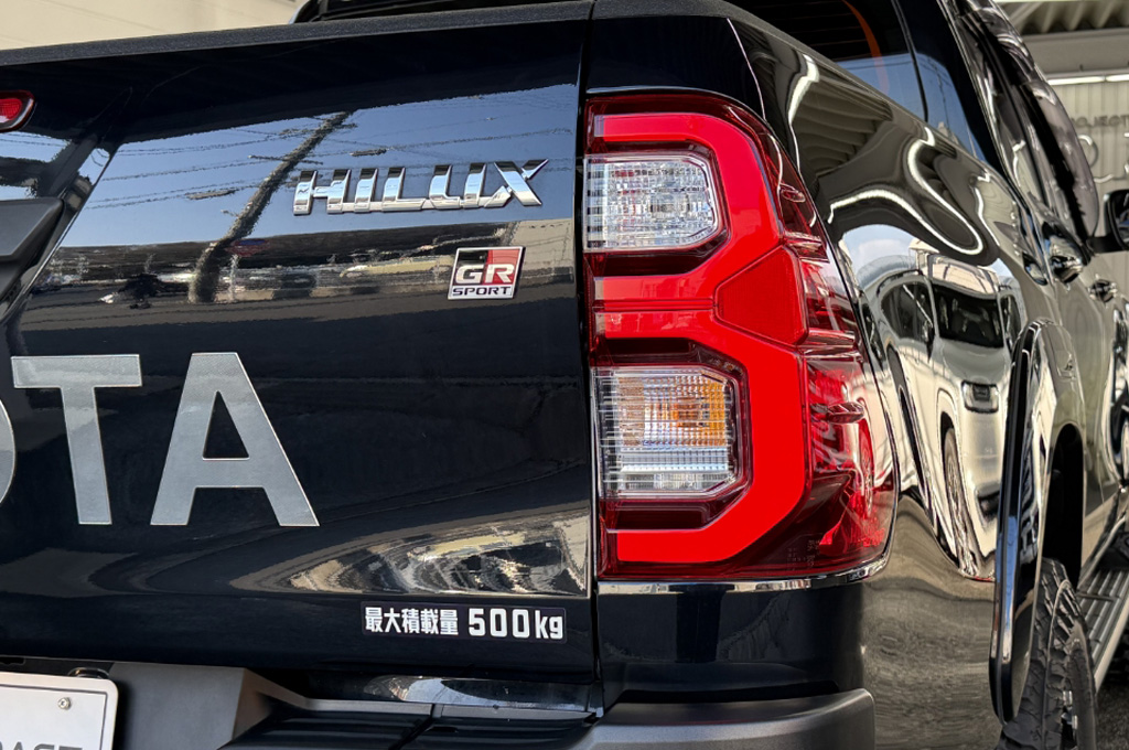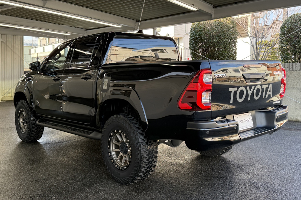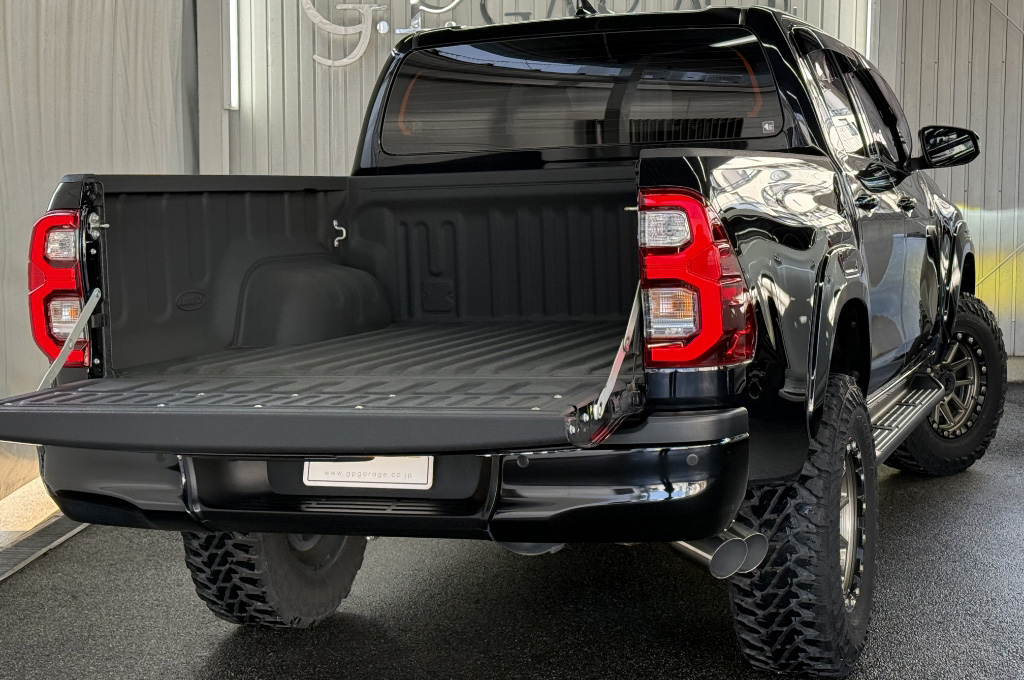 TOYOTAデカールとFUJITSUBO2本出しマフラーで後ろ姿もカッコイイ!ハイラックスZ GRスポーツのアティチュードブラックマイカが入庫しました♪