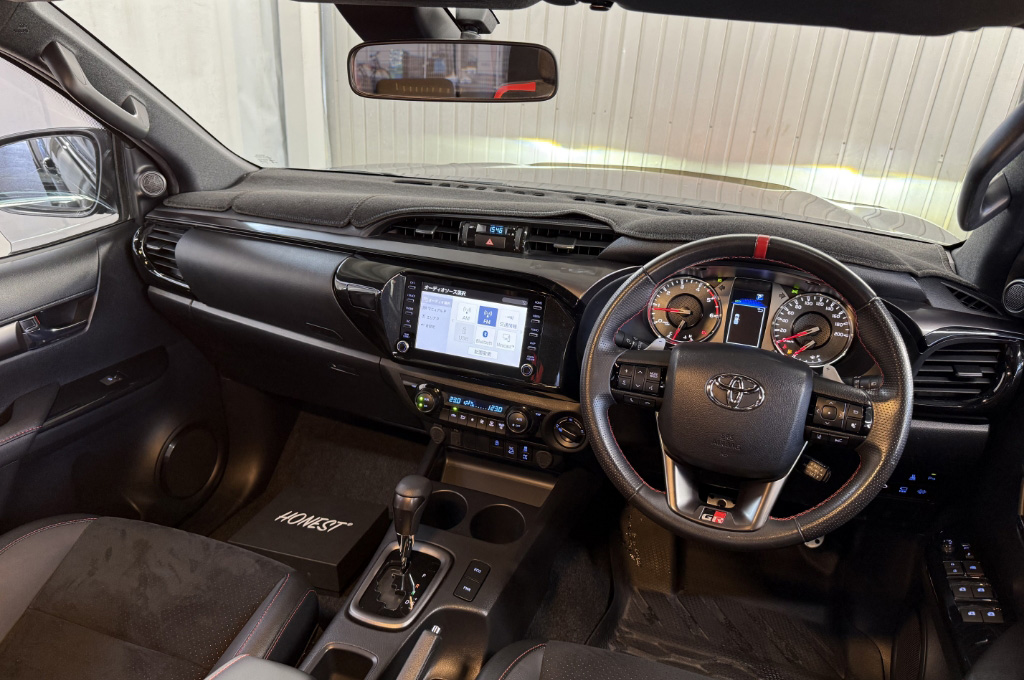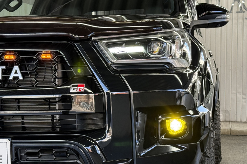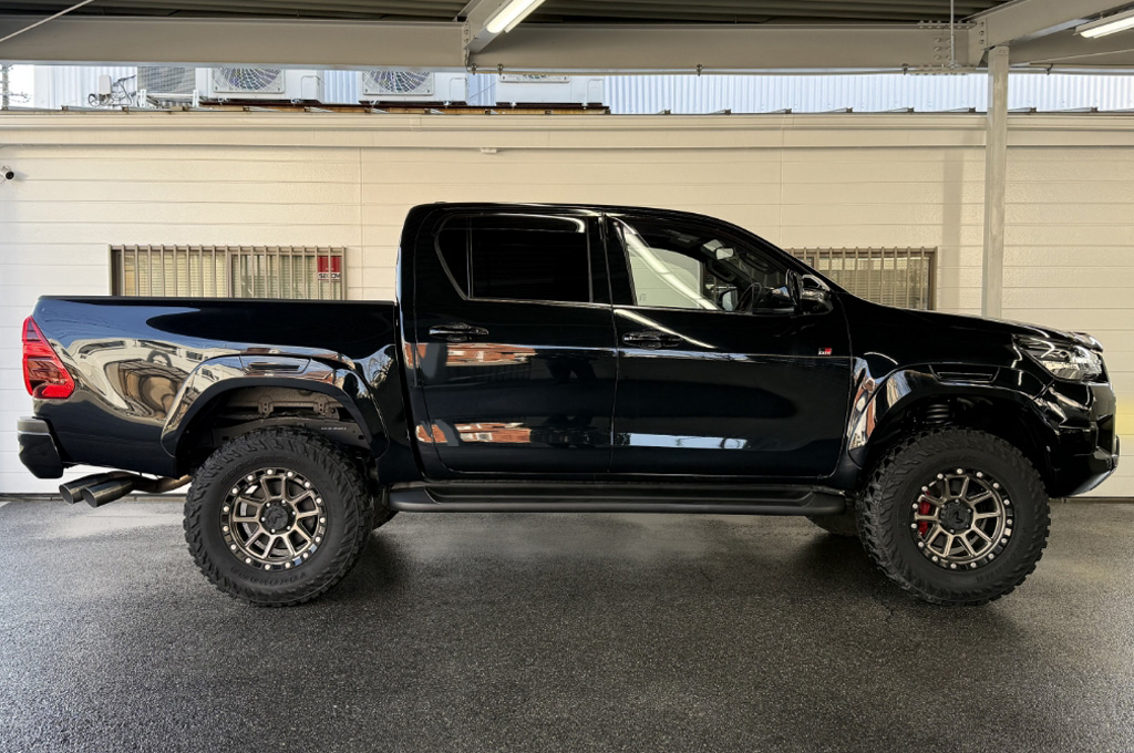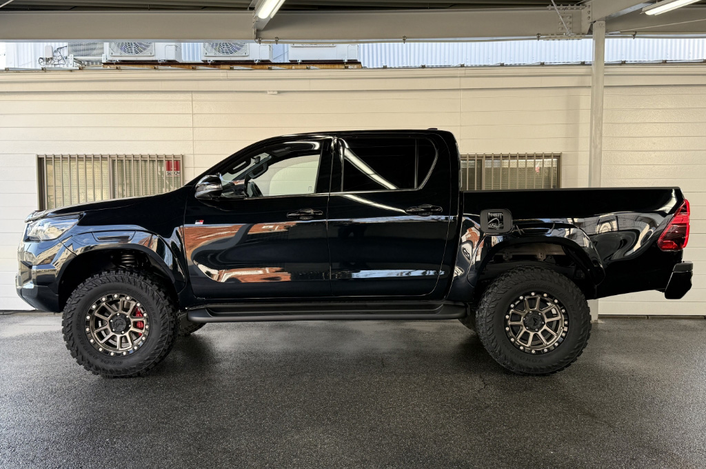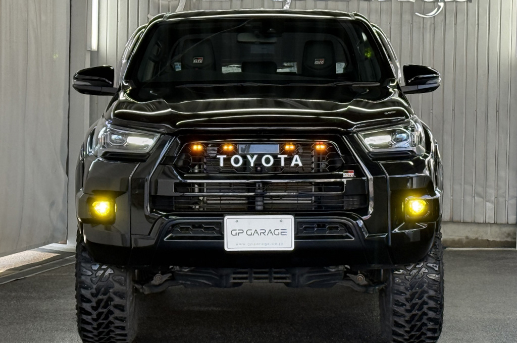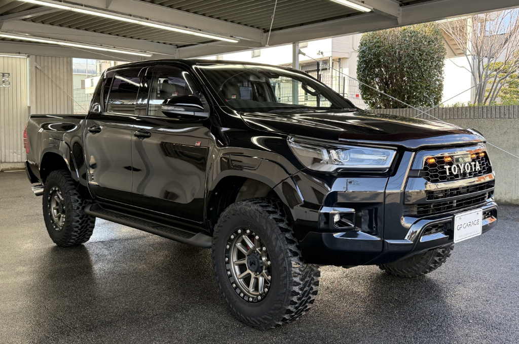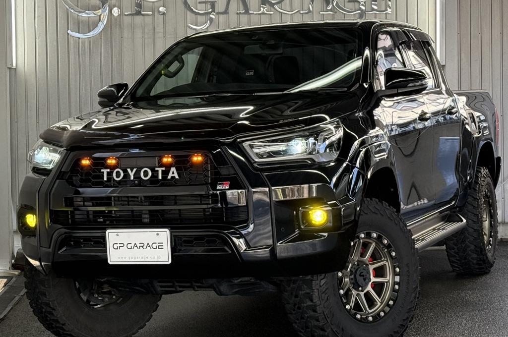 TOYOTAデカールとFUJITSUBO2本出しマフラーで後ろ姿もカッコイイ!ハイラックスZ GRスポーツのアティチュードブラックマイカが入庫しました♪